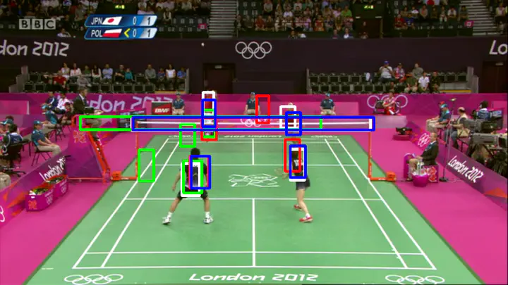 In this paper we propose a novel approach for tracking multiple object in structured sports videos using graphs. The objects are tracked by combining particle filter and frame description with Attributed Relational Graphs. We start by learning a probabilistic structural model graph from annotated images and then use it to evaluate and correct the current tracking state. Different from previous studies, our approach is also capable of using the learned model to generate new hypotheses of where the object is likely to be found after situations of occlusion or abrupt motion. We test the proposed method on two datasets: videos of table tennis matches extracted from YouTube and badminton matches from the ACASVA dataset. We show that all the players are successfully tracked even after they occlude each other or when there is a camera cut.